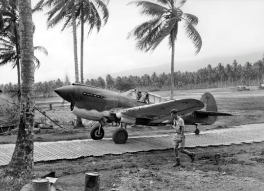 RAAF Sqn.L. Keith W "Bluey" Truscott taxiing his P-40E Kittyhawk along the Marston Mats at Milne Bay Fighter Strip #3, Milne Bay, New Guinea, Sep 1942. | Cleaning of 75mm anti-ship gun on US Army Air Force B-25G, 820 BS, 1944 | ||||||||||||||||||||