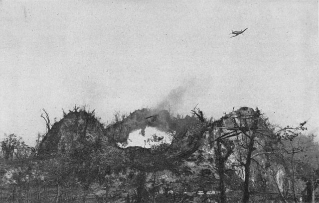 Landing Ship Tank LST-225 unloads amphibious tracked vehicle off Peleliu, 15 Sep 1944. | Dropping of napalm on Umurbrogol mountain range by a Marine Corps F4U Corsair. | |||||