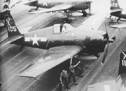 Startvorbereitung von F6F-5 Hellcats auf der CV-18 Wasp; in der Bildmitte die 5. Maschine der VF-86 |
