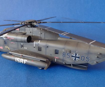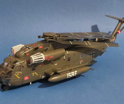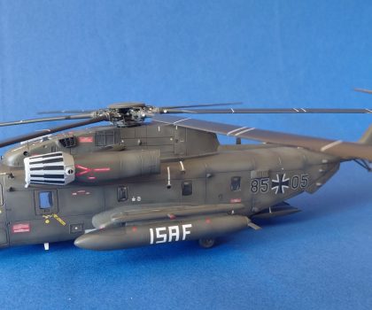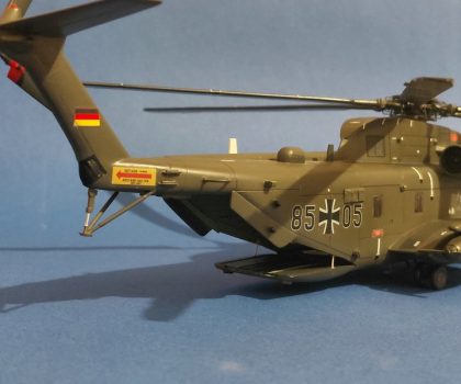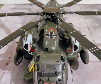 Die Träger für die Zusatztanks sind aus dem älteren Fujimi-Bausatz, weil sie da besser abgespritzt waren. Die Tanks selbst sind aus dem Wingman-Set und aus Resin. Es würden auch die Tanks von Italeri passen, da müssen dann aber die Flügel am Tankende verändert werden. Die typischen deutschen Antennen unter dem Rumpf stammen aus dem Revell-Bausatz. Die seitliche Tür und die Heckrampe habe ich offen dargestellt; genauso wie das seitliche, rechte Cockpitfenster. Sämtliche Sensoren und die Täuschkörperwerfer stammen aus dem Wingman-Set. Die markante SATCOM-Antenne auf dem Rumpfrücken ist selbst gemacht, genauso wie der veränderte Auslass der APU auf der linken Seite oberhalb des Triebwerks. Durch einen perfekten Zufall kam im Dezember ein neuer Decal-Bogen für deutsche CH-53 von HaHen auf den Markt und wurde sofort bestellt. Nach der Lackierung mit Revell 36142 Gelboliv und Glanzlack wurden die Decals aufgebracht, die sich völlig problemlos verarbeiten lassen. Danach nochmal Ganzlack zum Versiegeln, dann erst der abschließende Tamiya-Mattlack. Auch einige Decals aus dem alten Revell-Bausatz kamen zum Einsatz. Dann kam mir noch ne Idee…