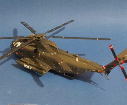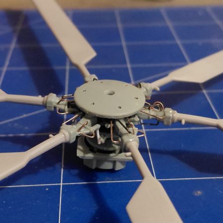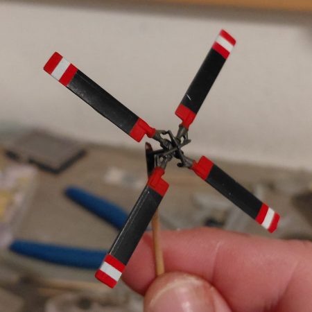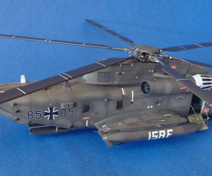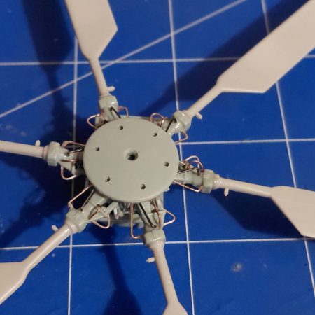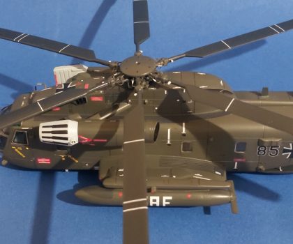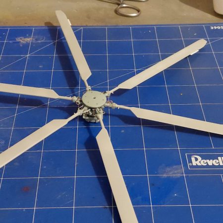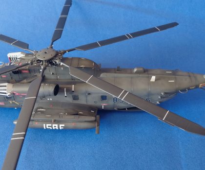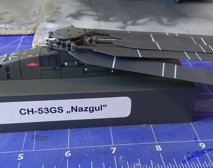 Der Basisbausatz ist der aktuelle Academy Bausatz der CH-53D. Das ist auch die Fujimi-Form, aber mit einer Kanzel ohne angegossenen Luftbetankungsanschluss. Der komplette Rumpf und der Rotorkopf stammt aus diesem Bausatz. Die IRB-Blätter sind aber aus dem Italeri HH-53C Bausatz und entsprechend modifiziert. Dann wurden am Rotorkopf noch allerlei Leitungen angebracht – 6 pro Blatt, also 36 Stück. Den Rotor hab ich abnehmbar gebaut.