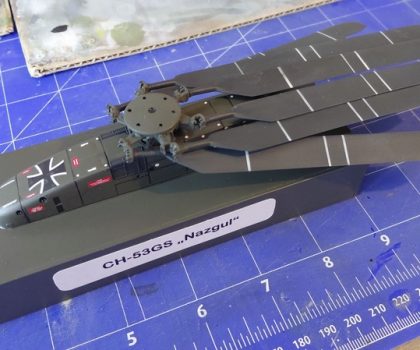 Auch in 1:72 ist die CH-53 ein stattliches Modell mit entsprechendem Rotordurchmesser und der Platz in der Vitrine ist knapp. Also habe ich aus den Reststücken von Fujimi, den Blattfaltgelenken von DF Helo Stuff und den Resinblättern von Wingman einen zweiten, angeklappten Rotorkopf gebaut; diesen aber ohne Leitungen. Irgendwo muss ich ihn ja anfassen können. Und so kann ich jetzt auf Ausstellungen mal den Rotorkopf wechseln und die CH-53 in der Vitrine platzsparend parken. Um den zweiten Rotorkopf auch auf Ausstellungen zeigen zu können, hab ich mir aus den Resten des Fujimi-Bausatzes und Polystyrolplatten noch ne kleine Base zusammengebastelt…..