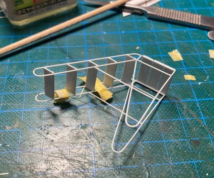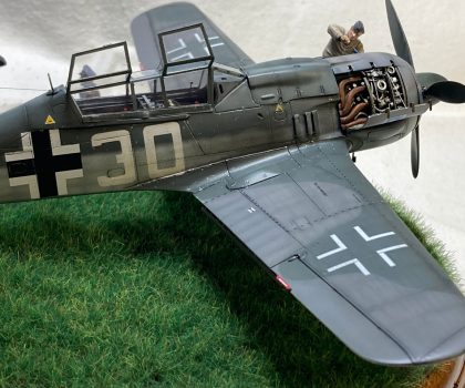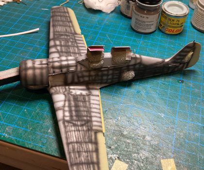 Rumpf und Tragflächen wurden vollständig nach Vorbildunterlagen benietet. Die Lackierung erfolgte nach Grundierung und Schattierung. Für die Markierungen wurden wurden teilweise Abziehbilder des Bausatzes und welche aus der Restekiste verwendet. Die Balkenkreuze und Ziffern auf dem Rumpf sind auflackiert (Danke Thomas für die Masken!).
