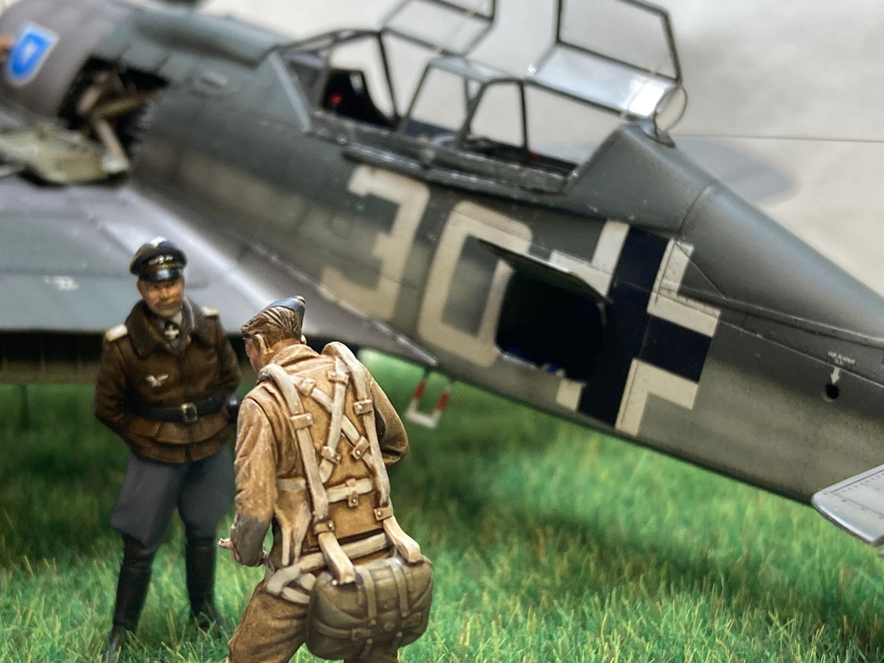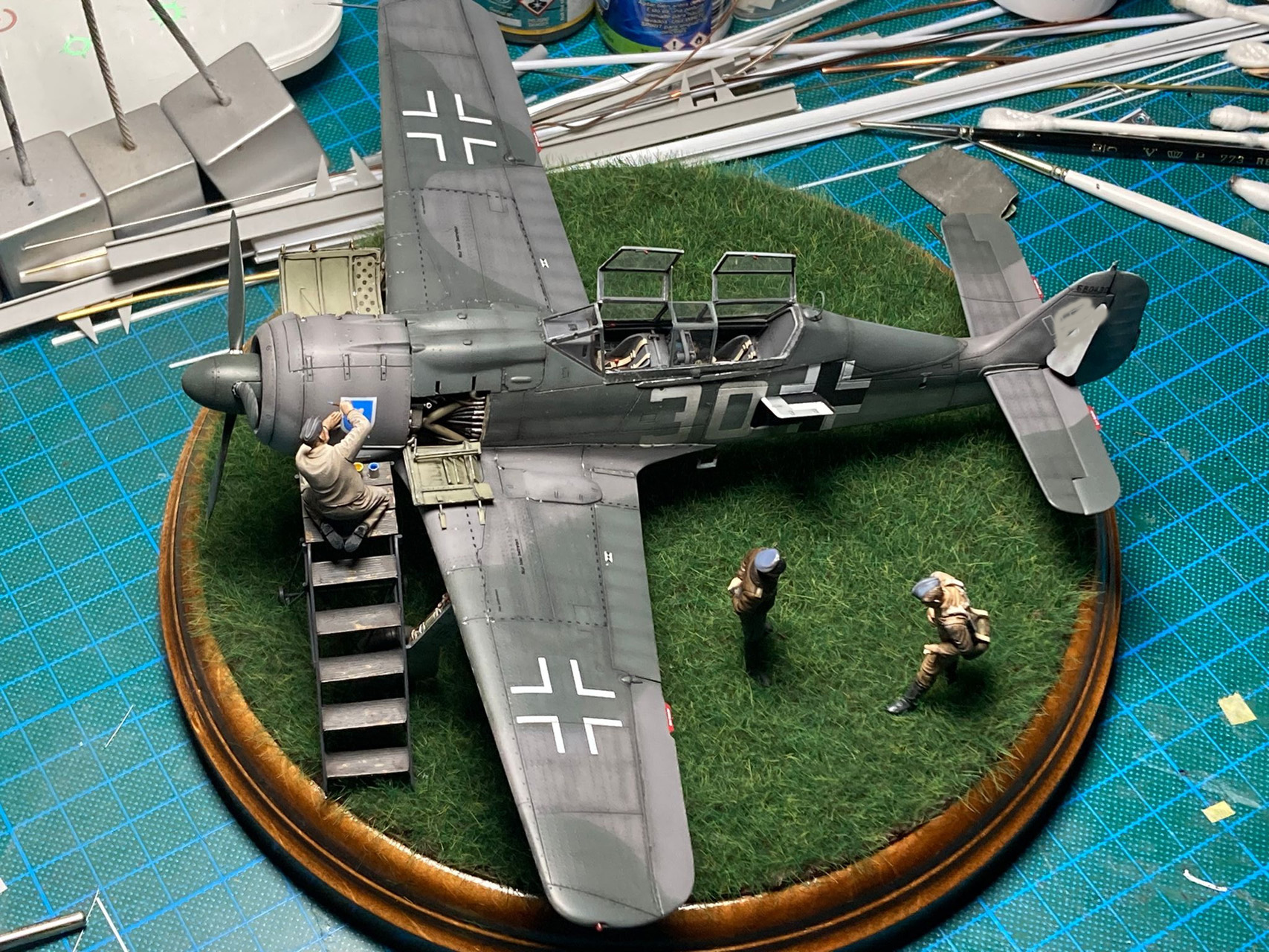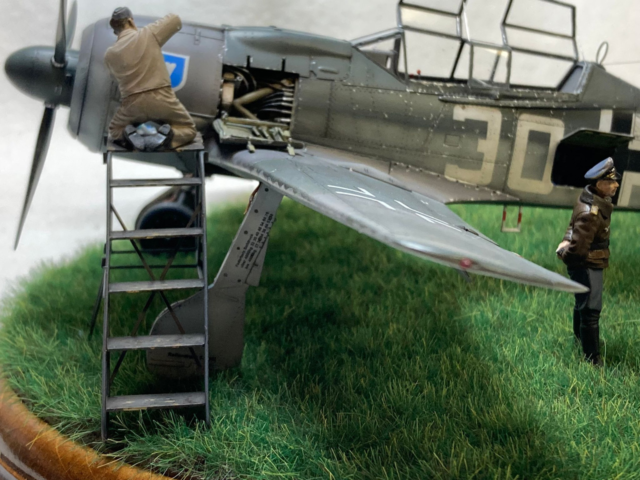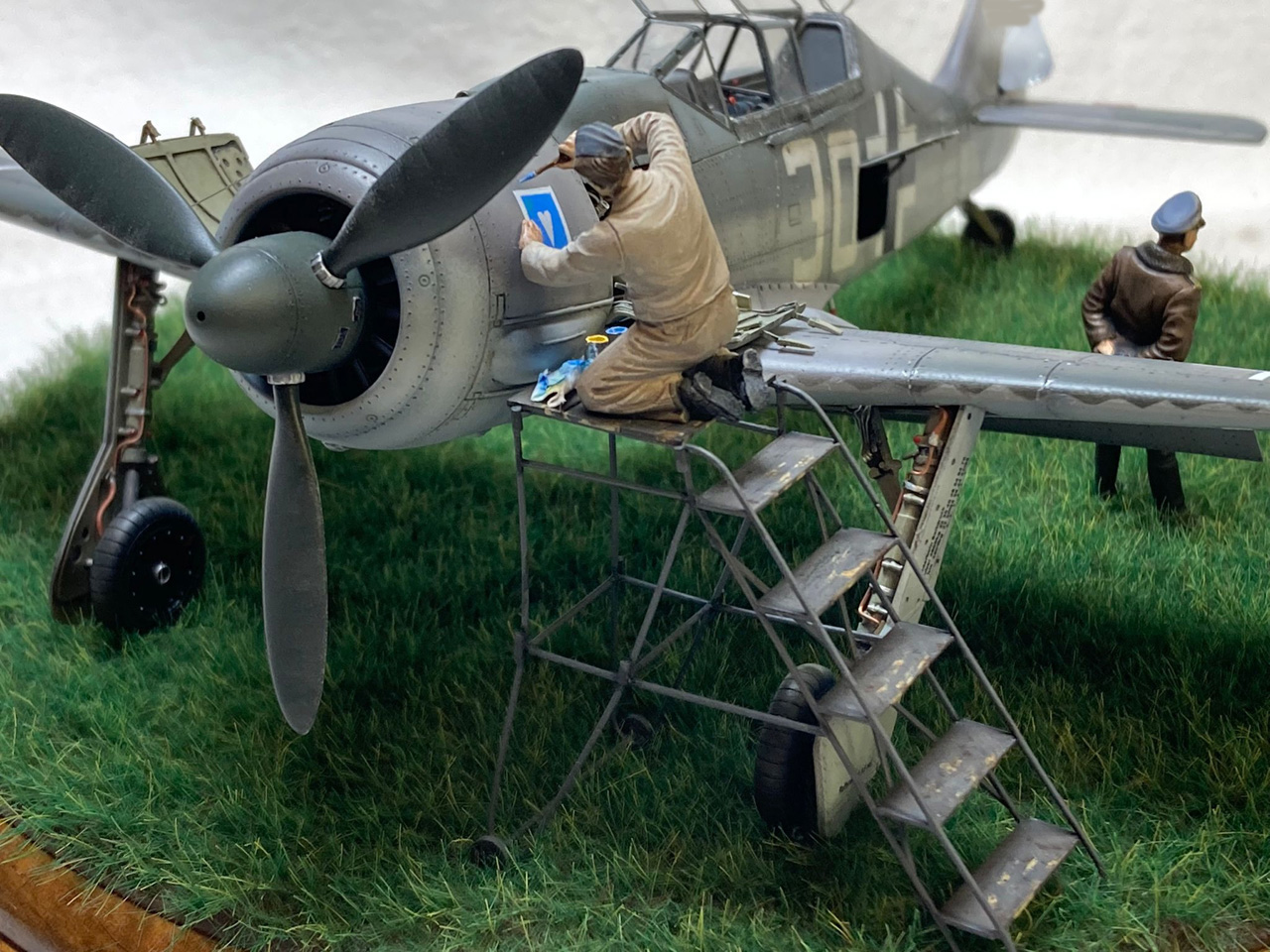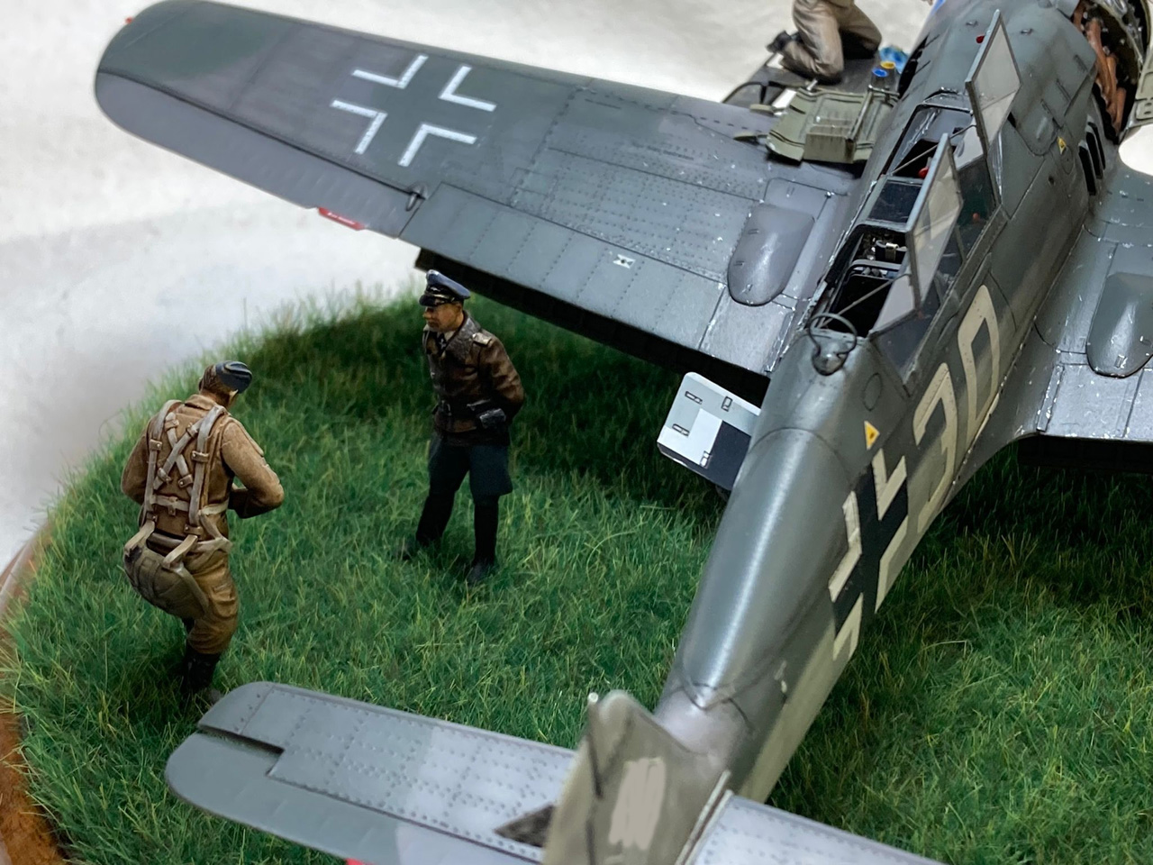 Die Figuren sind aus dem Set German Luftwaffe Pilots and Ground Personnel (48082) von ICM, wobei ich dem Mechaniker den Schraubenschlüssel aus der Hand genommen habe und ihn zum Lackierer machte. Die Wartungsbühne entstand wiederum im Eigenbau. Ein kleiner Rundsockel bildet die Basis für die Präsentation des Modells. Ich habe darauf lediglich eine Begrasung mittels eines elektrostatischen Begrasungsgerätes vorgenommen.