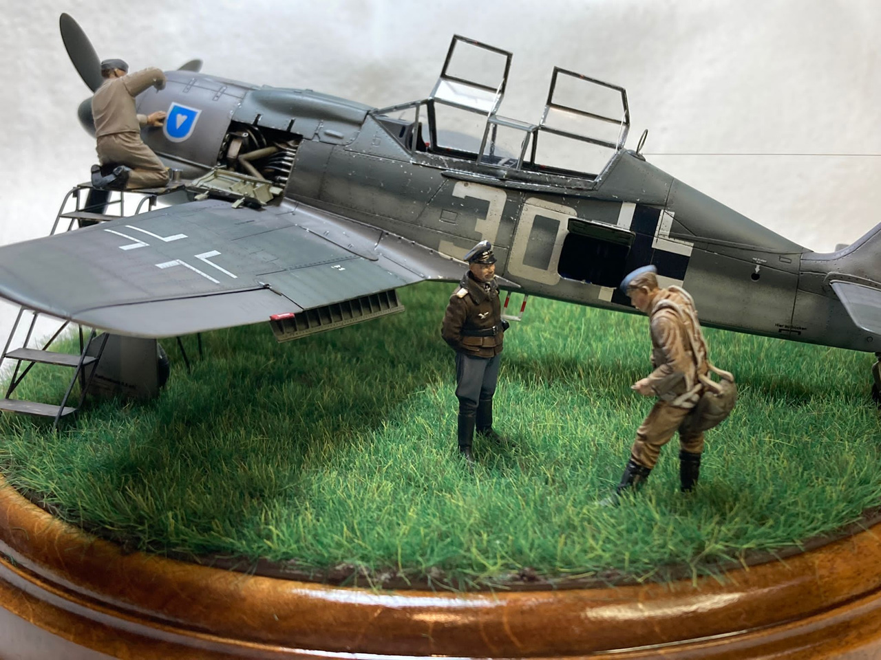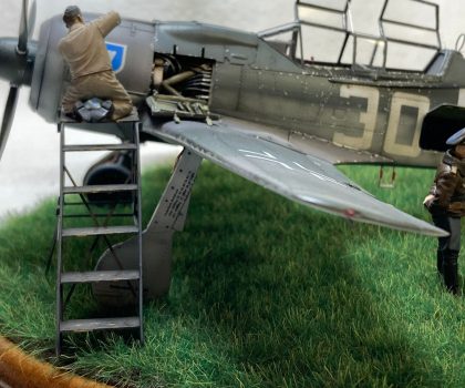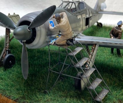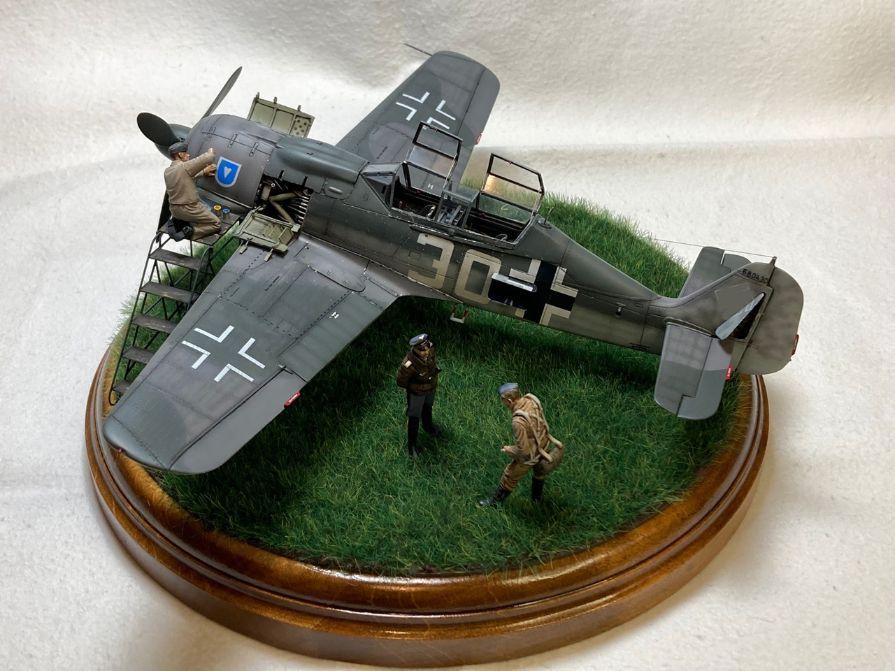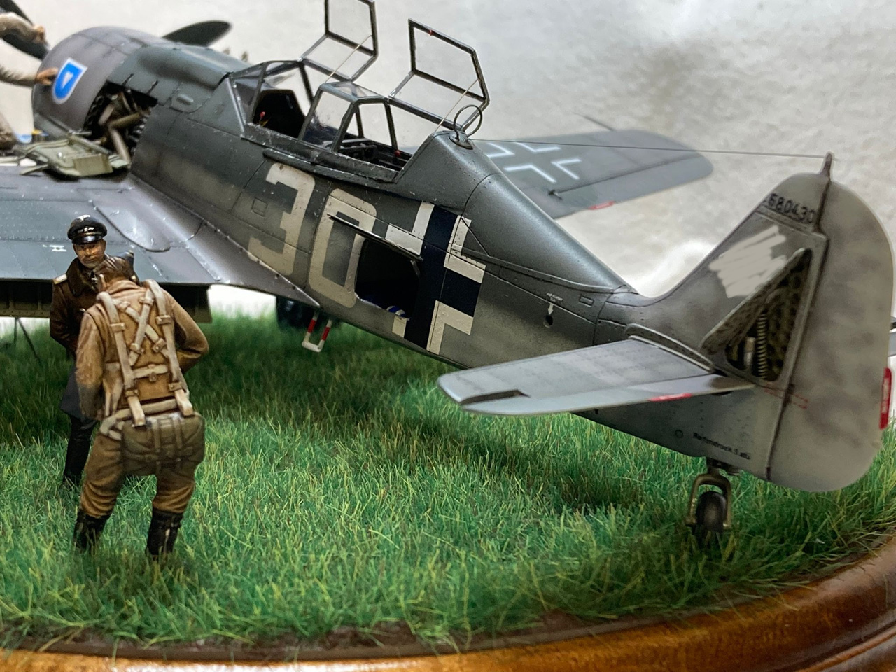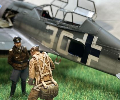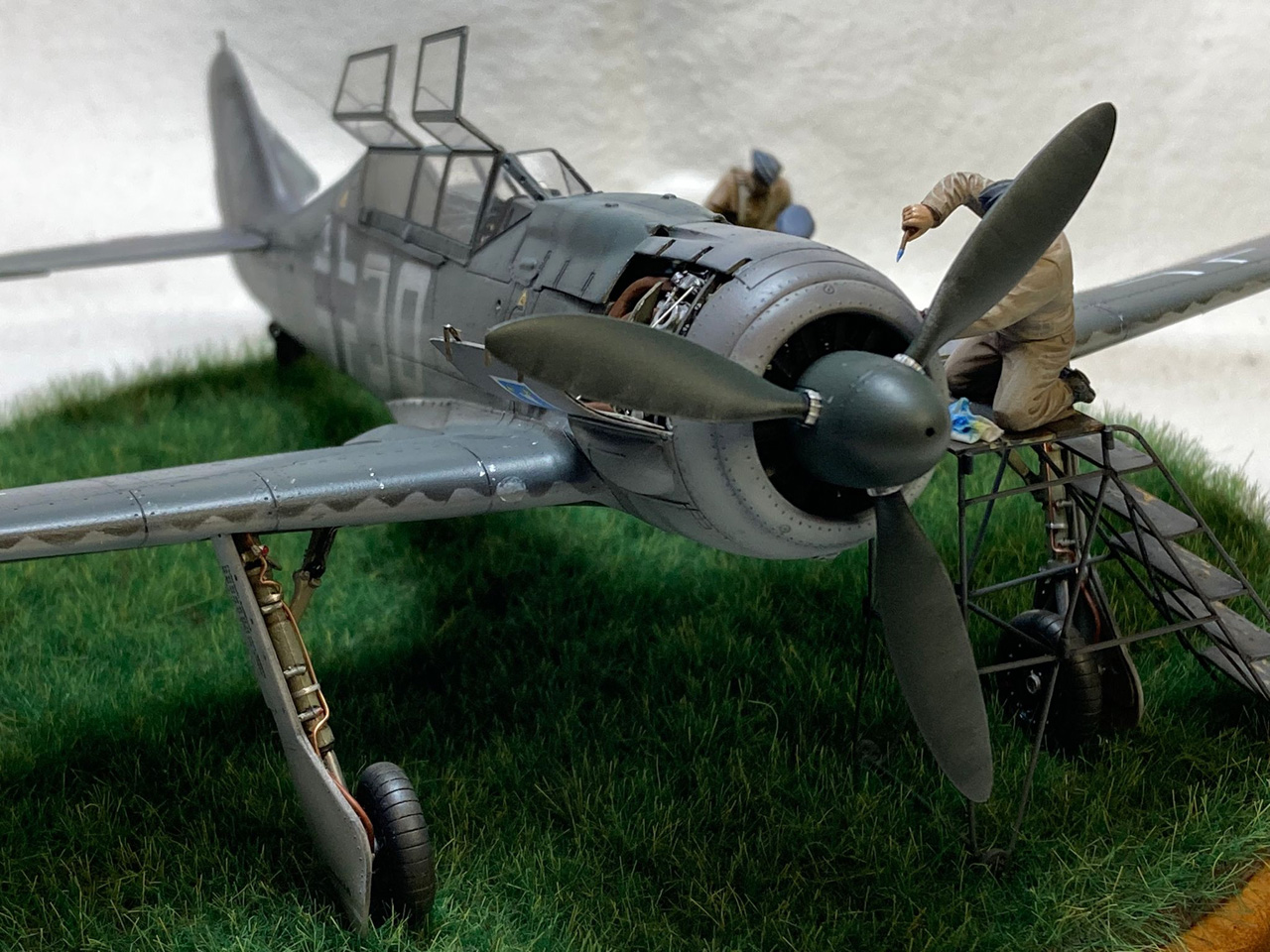 Die Figuren sind aus dem Set German Luftwaffe Pilots and Ground Personnel (48082) von ICM, wobei ich dem Mechaniker den Schraubenschlüssel aus der Hand genommen habe und ihn zum Lackierer machte. Die Wartungsbühne entstand wiederum im Eigenbau. Ein kleiner Rundsockel bildet die Basis für die Präsentation des Modells. Ich habe darauf lediglich eine Begrasung mittels eines elektrostatischen Begrasungsgerätes vorgenommen.