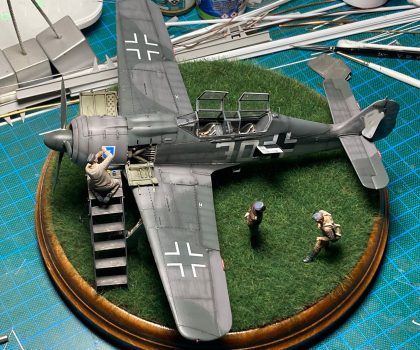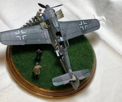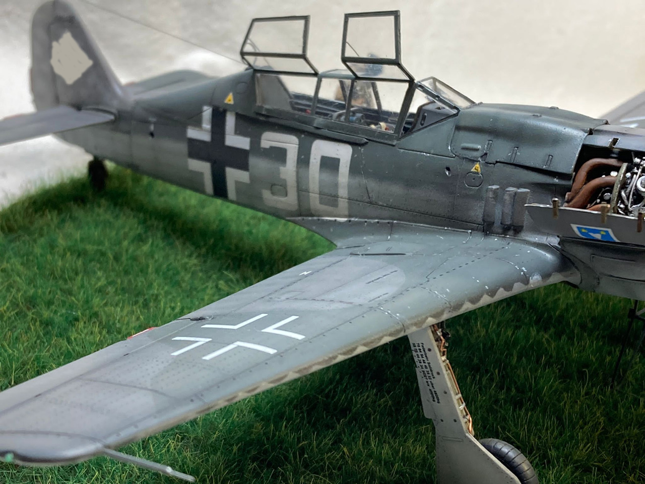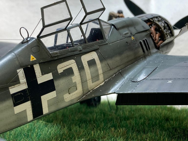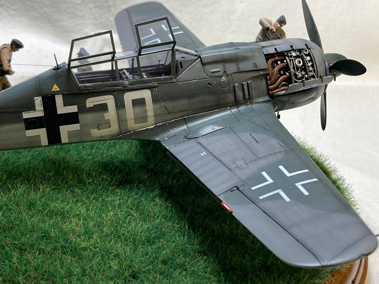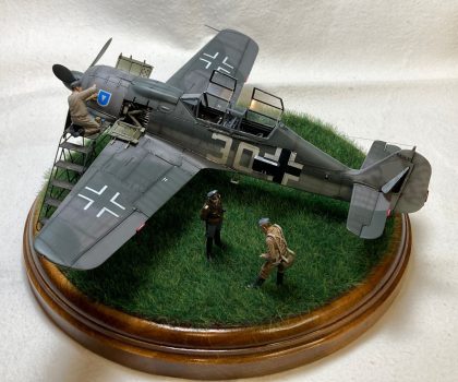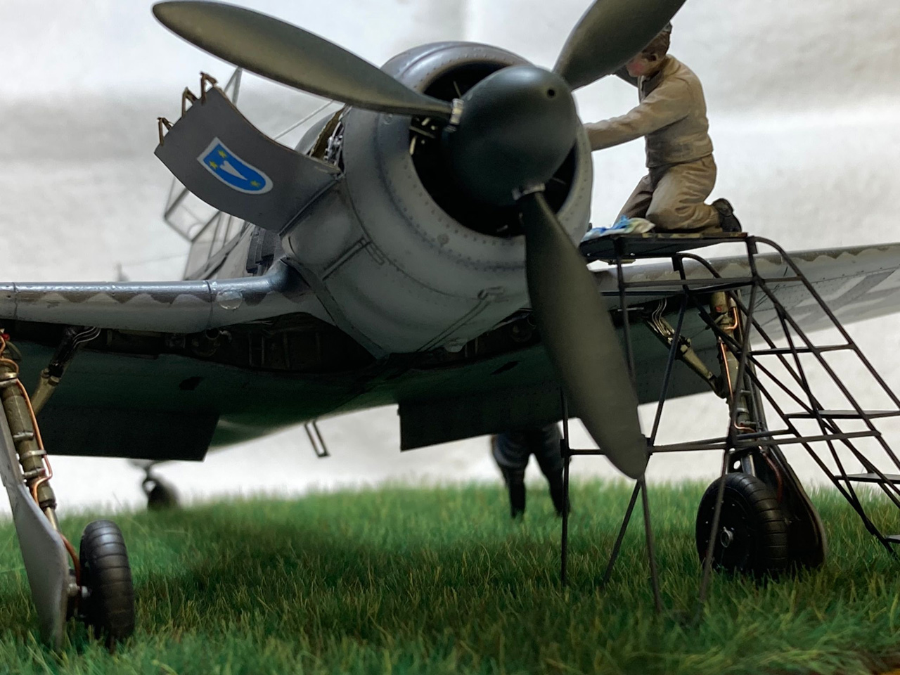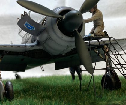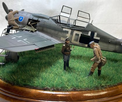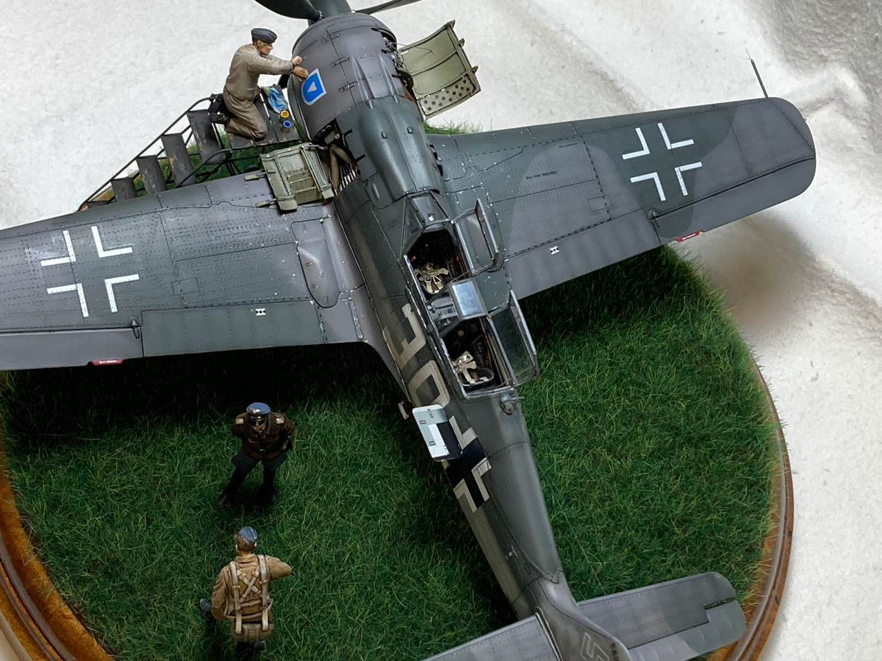 Die Figuren sind aus dem Set German Luftwaffe Pilots and Ground Personnel (48082) von ICM, wobei ich dem Mechaniker den Schraubenschlüssel aus der Hand genommen habe und ihn zum Lackierer machte. Die Wartungsbühne entstand wiederum im Eigenbau. Ein kleiner Rundsockel bildet die Basis für die Präsentation des Modells. Ich habe darauf lediglich eine Begrasung mittels eines elektrostatischen Begrasungsgerätes vorgenommen.