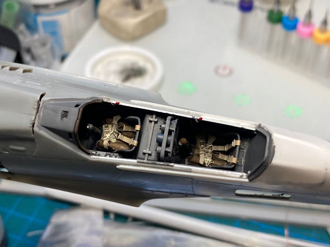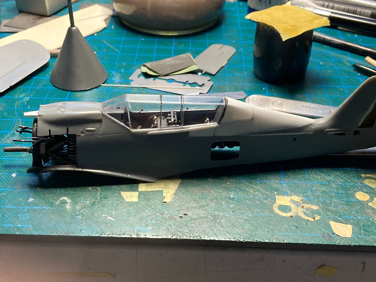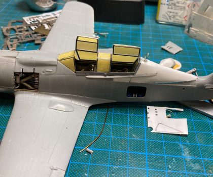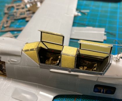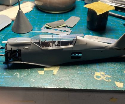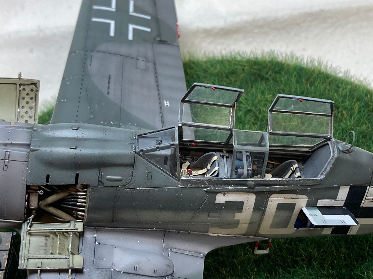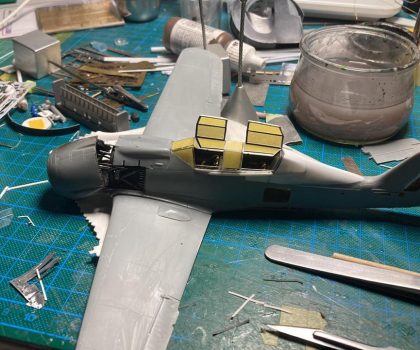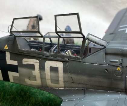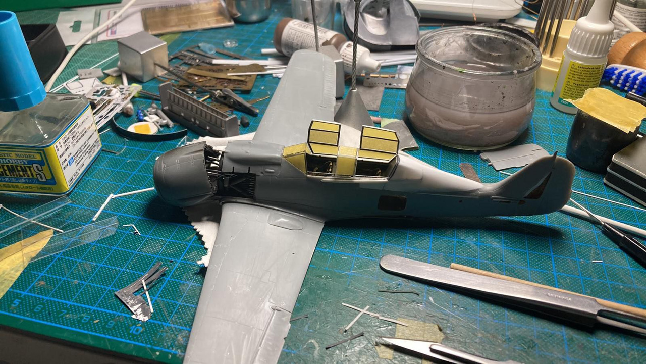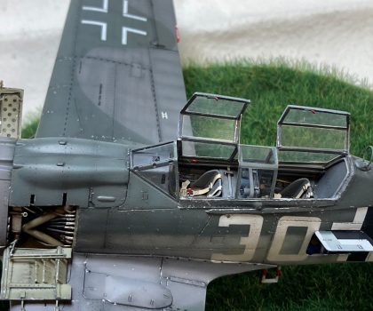 Wie beim Vorbild trennte ich den Rumpf an der entsprechenden Stelle durch, verlängerte ihn durch Kunststoffplatten und formte vor allem den Übergang vom Cockpit zum Rumpf komplett mittels 2-Komponenten-Spachtelmasse neu. Das wurde dann in Form geschliffen, bis ich damit zufrieden war und anschließend noch mit den wenigen erforderlichen Gravuren versehen. Verschiedene Wartungsklappen am Rumpf und Seitenleitwerk eröffnete ich bei der Gelegenheit auch, erstellte die Wartungsdeckel neu und gestaltete den Innenraum nach Vorbildfotos. Auch das zweite Cockpit ist fast vollständig in Eigenregie entstanden, nur der Sitz und das Instrumentenbrett fanden sich noch in der Ersatzteilkiste. Die Cockpit-Haube ist über einer selbst angefertigten Form im Eigenbau tiefgezogen.