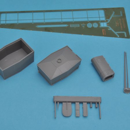 13 sehr sauber gegossene Resinteile und insgesamt acht photogeätzte Teile kommen zusammen mit einem Decalbogen und einem übersichtlichen Bauplan in einem stabilen Karton mit Styroporfüllung zur Vermeidung von Beschädigungen.