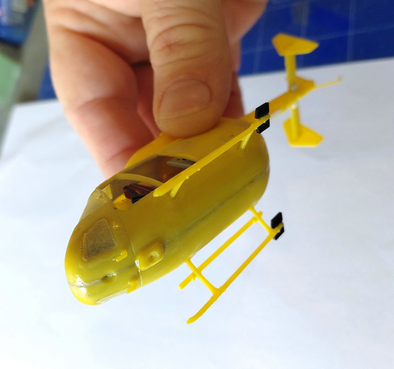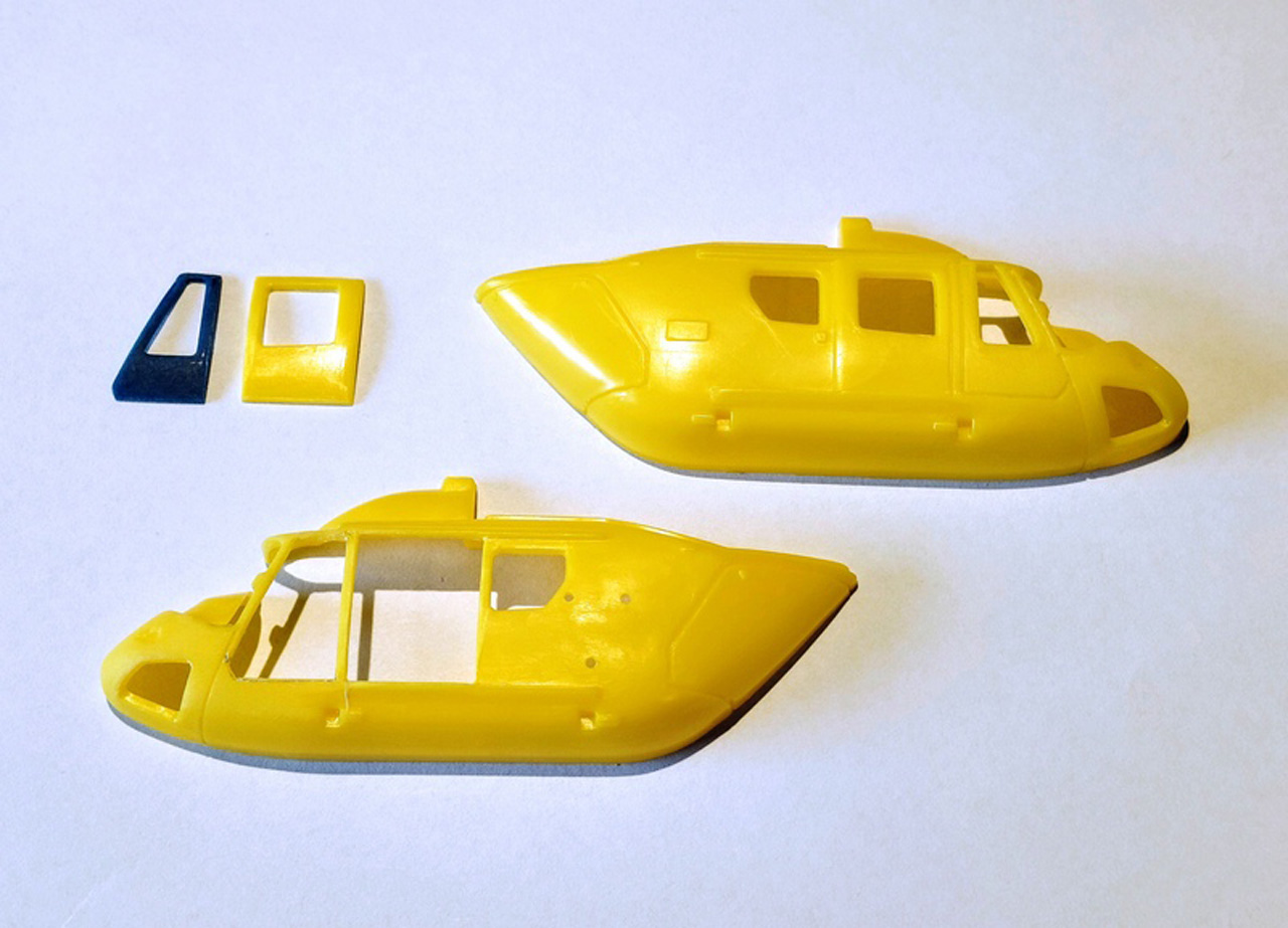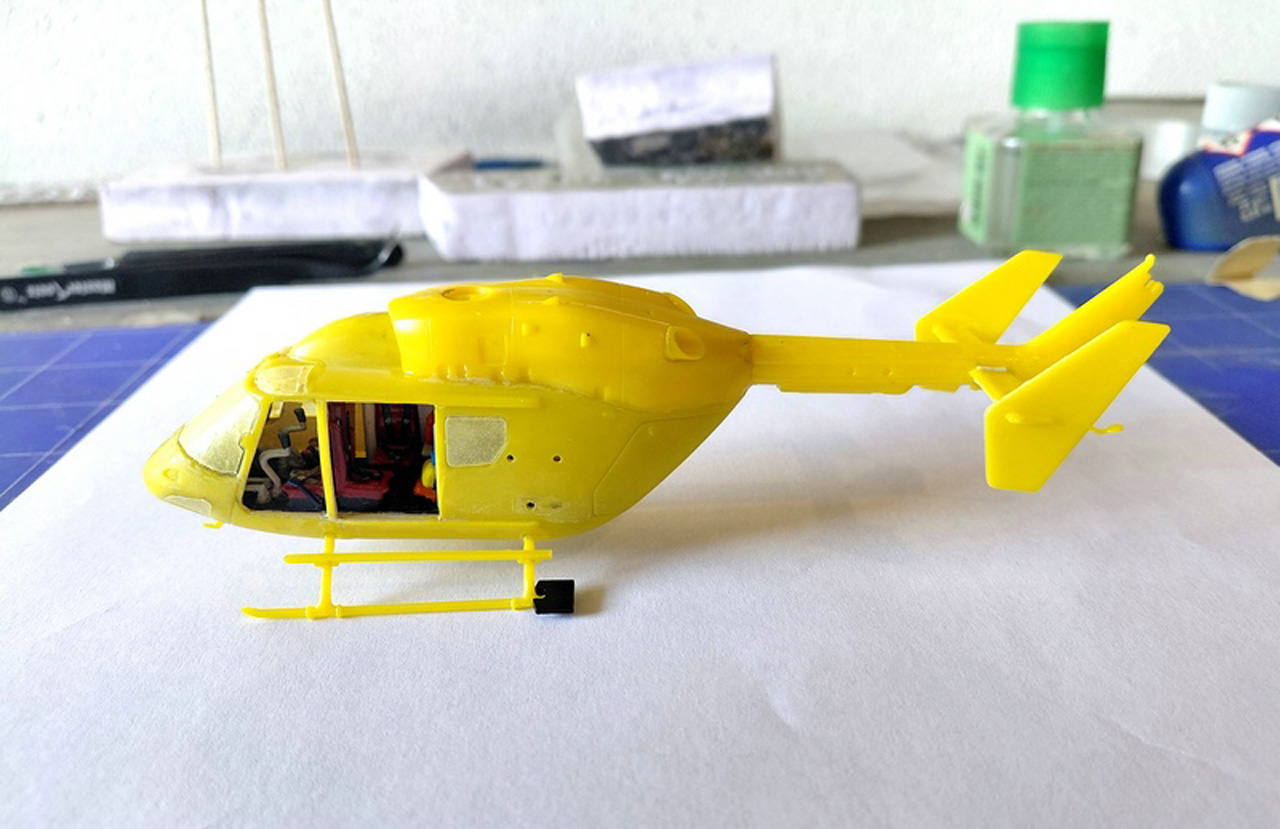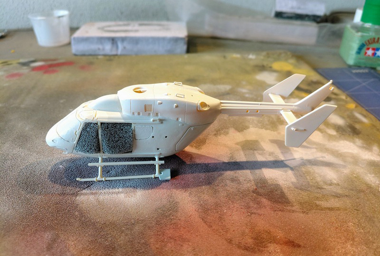 Die Rumpfhälften wurden verschlossen und verschliffen, unter dem Rumpf wurde ein zusätzliches Gehäuse für einen weiteren Landescheinwerfer angebracht. Der obere Teil der  Kabine (das Doghouse) stammt nicht aus dem Bausatz sondern von einer EC-145 von Revell. Diese ist ja der direkte Nachfolger der BK 117 und diese Teile sind identisch und deutlich besser in den Details. Der Heckausleger wieder stammt aus dem Bausatz.