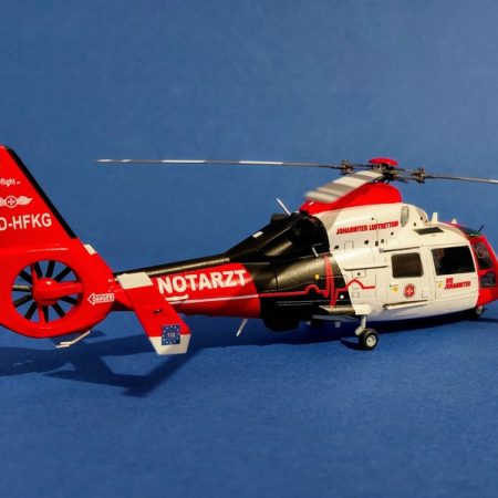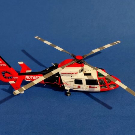 Das Modell entstand aus dem DreamModel Bausatz DM720005 des HH-65C/D Dolphin der US Coast Guard und musste nur geringfügig angepasst werden -vor allem am zu stumpf zulaufenden Ende des Fenestron-Gehäuses. Ansonsten stößt man beim Bau auf keine größeren Probleme, man sollte aber ein Buggewicht nicht vergessen. Die größte Schwäche des Bausatzes ist der Rotorkopf, der weder in der Form noch den Details dem Original entspricht. Aber es gibt eine Alternative von Metallic Details, die hier verbaut wurde. Trotz des Herstellernamens ist er aber aus Resin. Hierfür müssen aber einige Anpassungen am Modell erfolgen, die jedoch für einen Modellbauer, der Resin-Zubehör verwendet, kein Problem darstellen sollten.