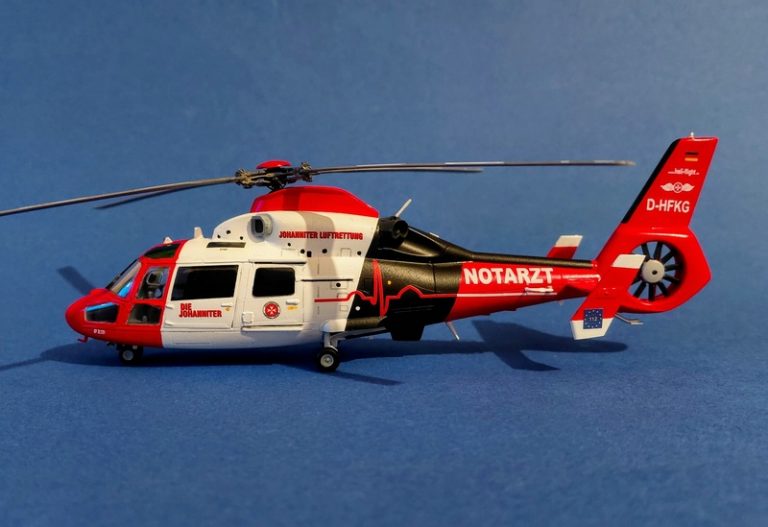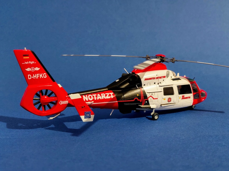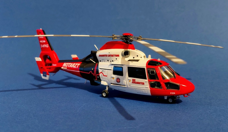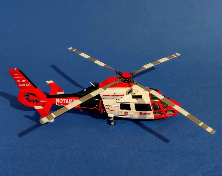 Das Modell entstand aus dem DreamModel Bausatz DM720005 des HH-65C/D Dolphin der US Coast Guard und musste nur geringfügig angepasst werden -vor allem am zu stumpf zulaufenden Ende des Fenestron-Gehäuses. Ansonsten stößt man beim Bau auf keine größeren Probleme, man sollte aber ein Buggewicht nicht vergessen. Die größte Schwäche des Bausatzes ist der Rotorkopf, der weder in der Form noch den Details dem Original entspricht. Aber es gibt eine Alternative von Metallic Details, die hier verbaut wurde. Trotz des Herstellernamens ist er aber aus Resin. Hierfür müssen aber einige Anpassungen am Modell erfolgen, die jedoch für einen Modellbauer, der Resin-Zubehör verwendet, kein Problem darstellen sollten.