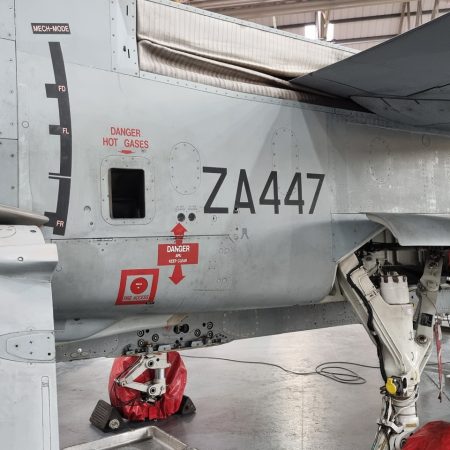 Die hier fotografierte Maschine mit der Kennung ZA447 wurde der Royal Air Force als GR.1 übergeben und später auf den Standard GR.4 aufgerüstet. Sie war im Golfkrieg 1991 im Einsatz und erwarb sich den Spitznamen “Mig Eater”.