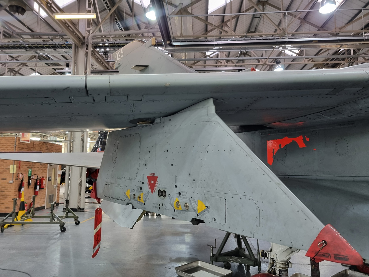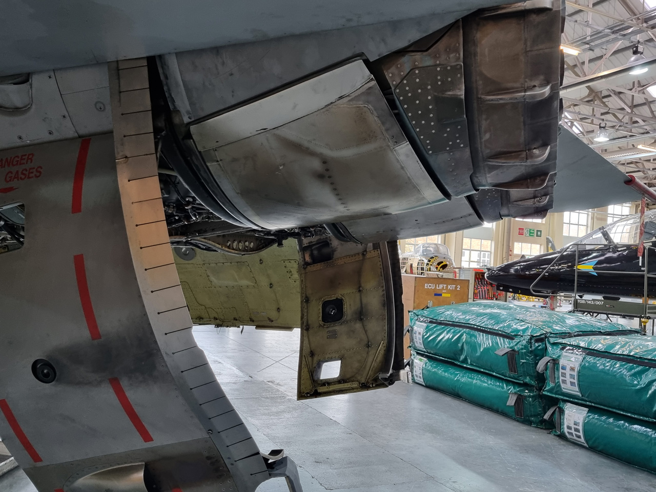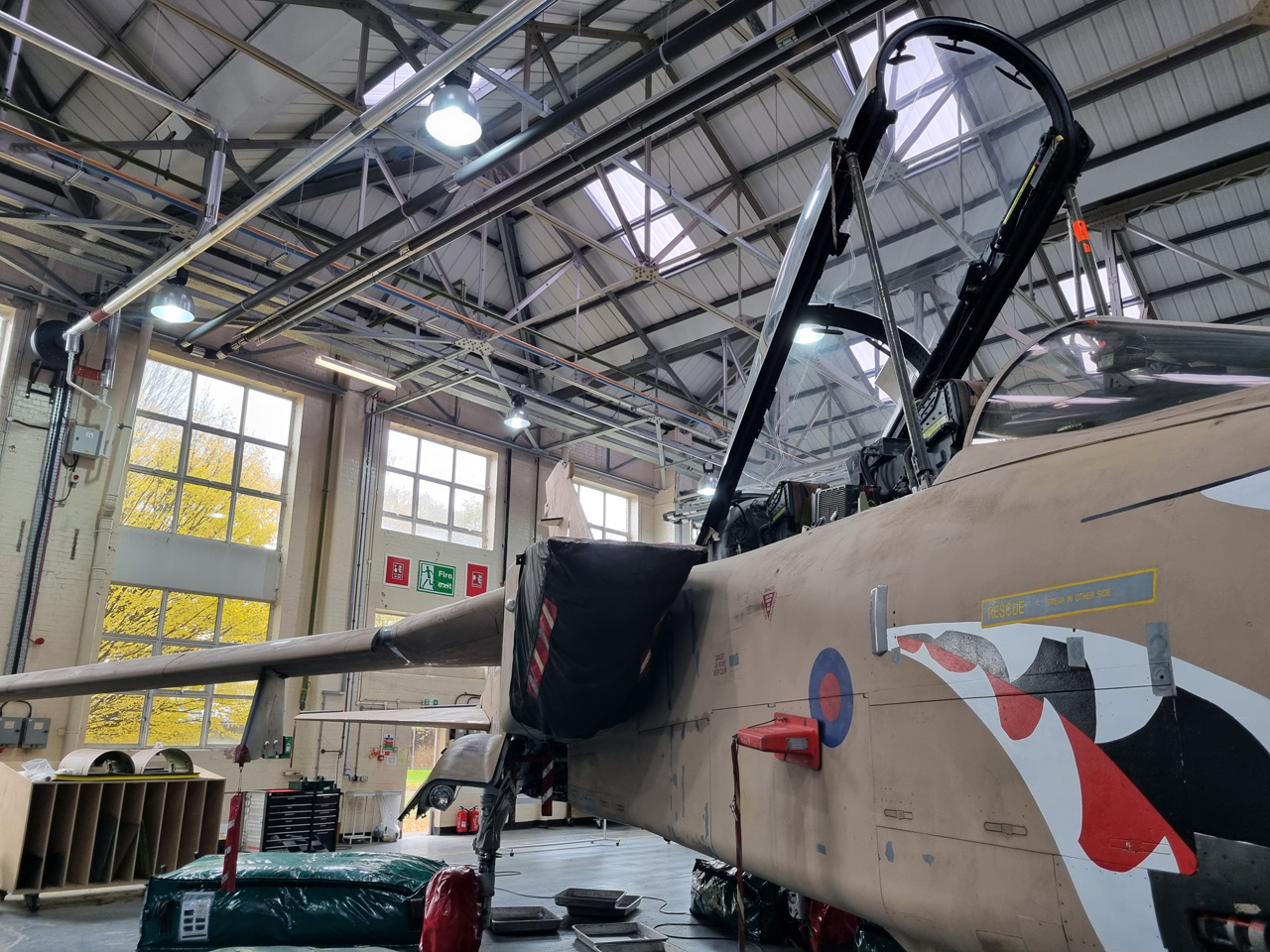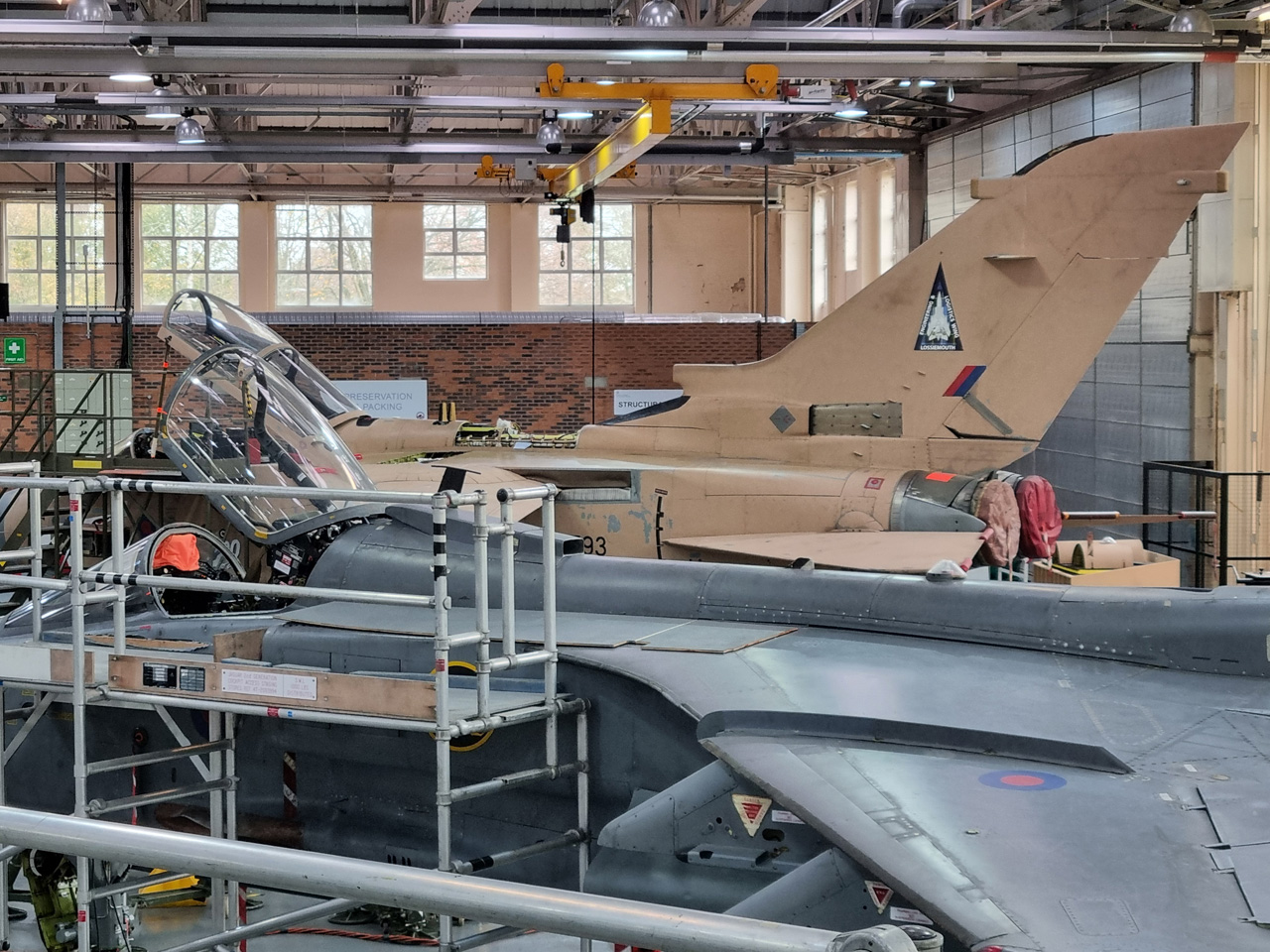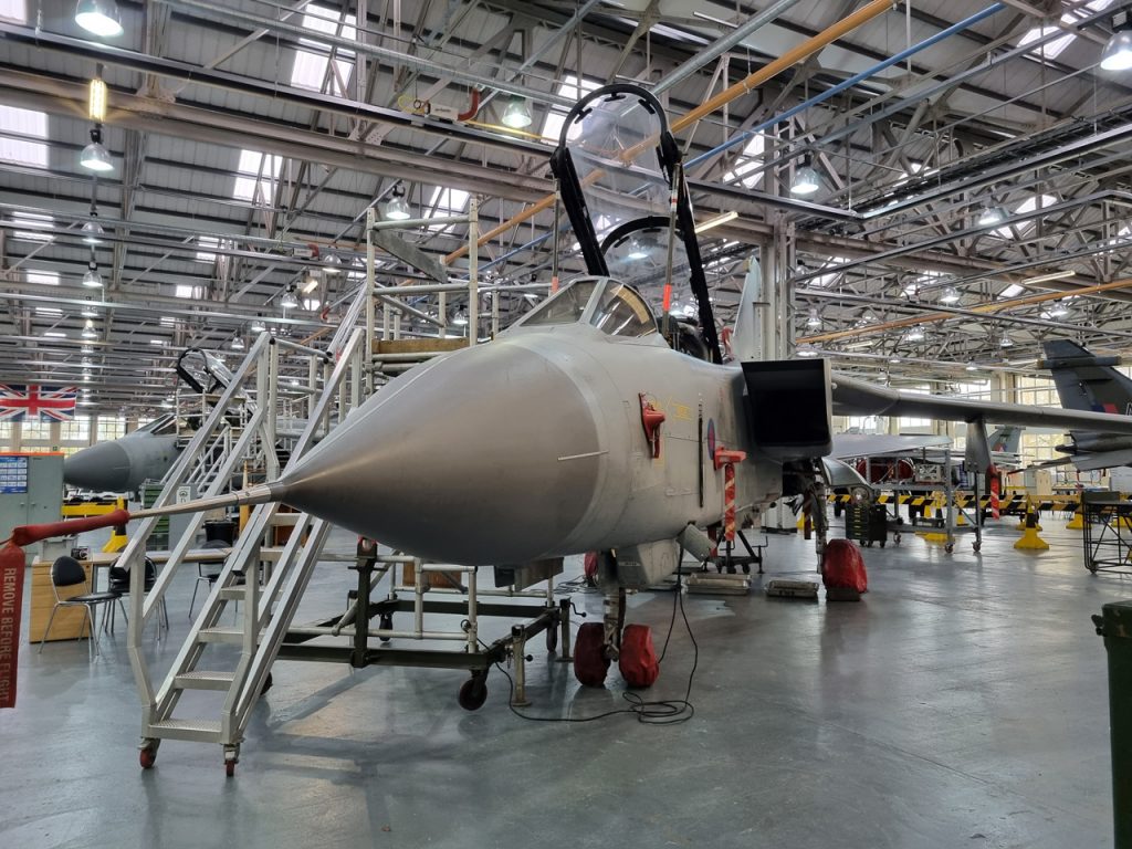 Die Mig Eater-Tornado stand in einfachem Grau in Cosford. Dafür wurde eine andere Tornado in der Wüstentarnung der Operationen Granby und Telic* lackiert und mit dem Haifischmaul der ZA447 versehen, das diese im Golfkrieg trug. Die im Wüstentarn bemalte Maschine war aber selbst nie dort im Einsatz und wurde erst später umlackiert. Interessant auch die Crash Pads unter den Flügeln, um die Verletzungsgefahr bei Stürzen vom Flügel zu verringern.