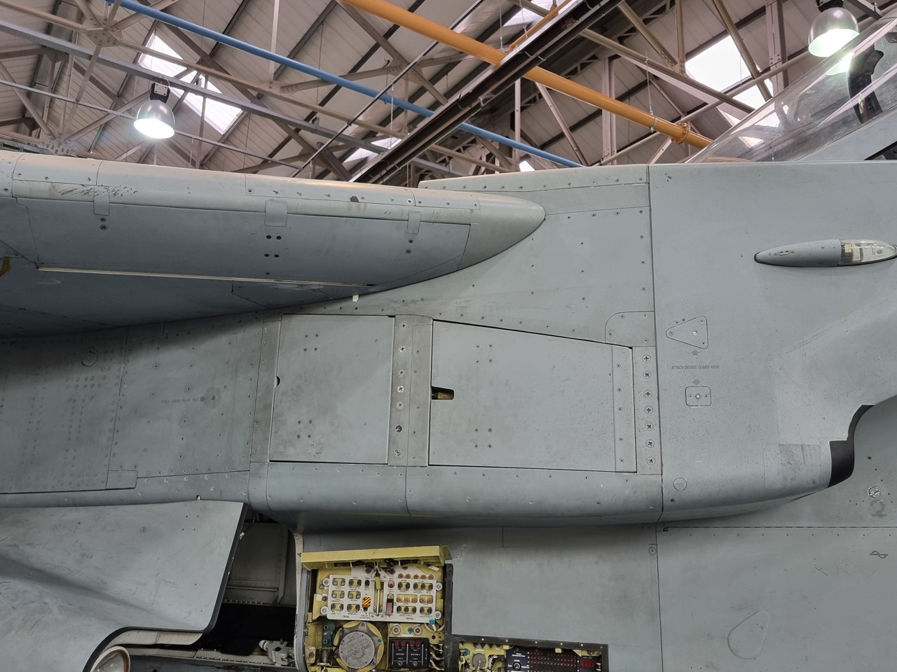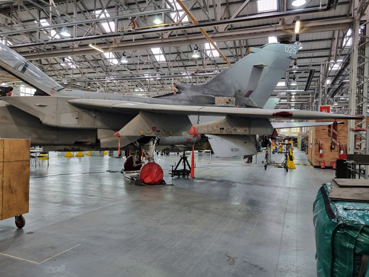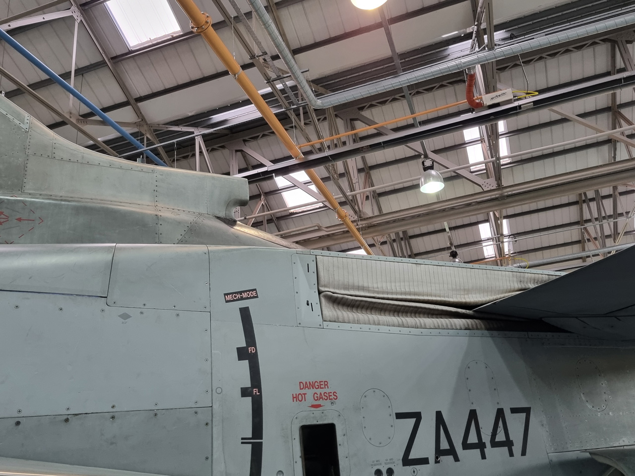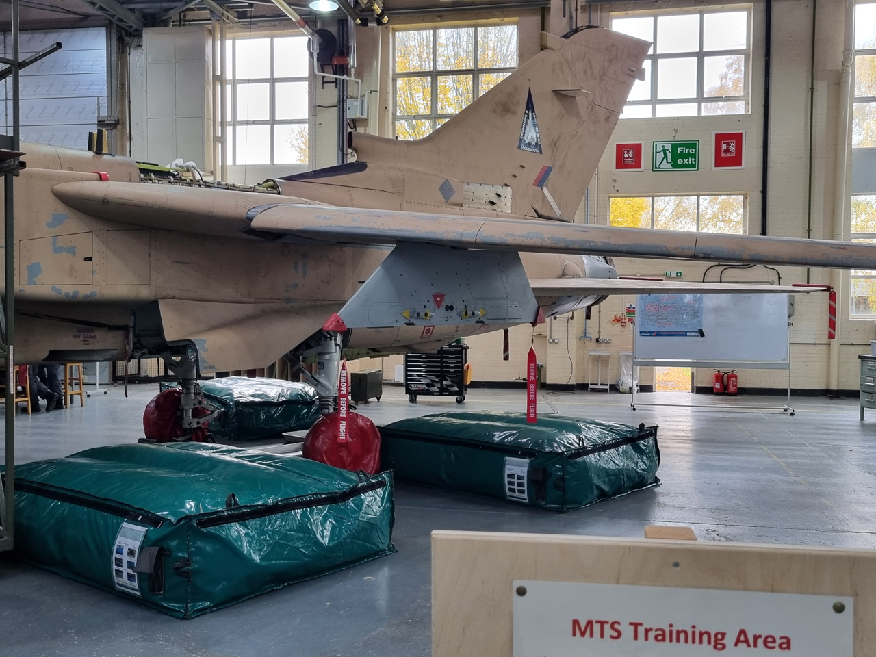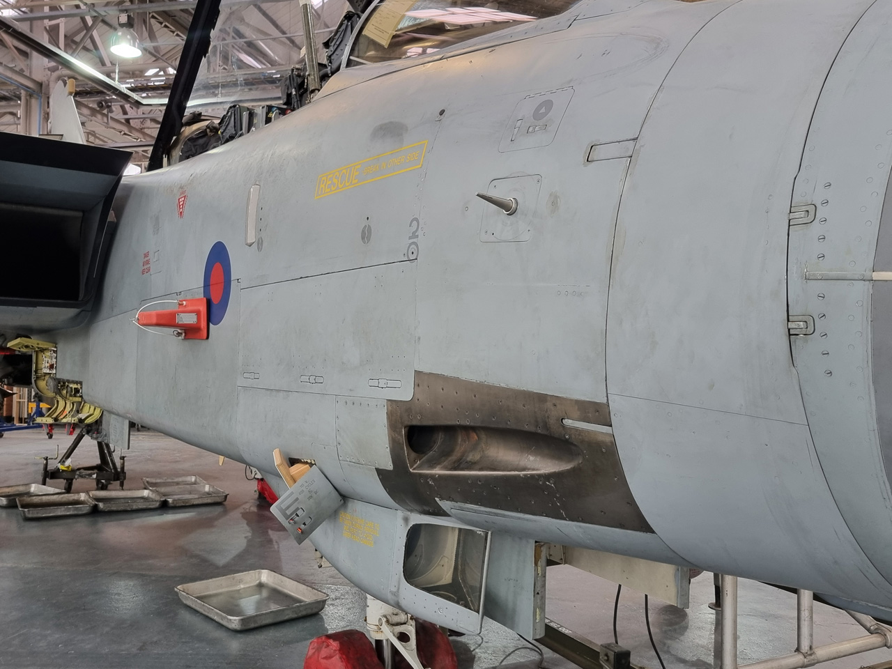 Die Mig Eater-Tornado stand in einfachem Grau in Cosford. Dafür wurde eine andere Tornado in der Wüstentarnung der Operationen Granby und Telic* lackiert und mit dem Haifischmaul der ZA447 versehen, das diese im Golfkrieg trug. Die im Wüstentarn bemalte Maschine war aber selbst nie dort im Einsatz und wurde erst später umlackiert. Interessant auch die Crash Pads unter den Flügeln, um die Verletzungsgefahr bei Stürzen vom Flügel zu verringern.