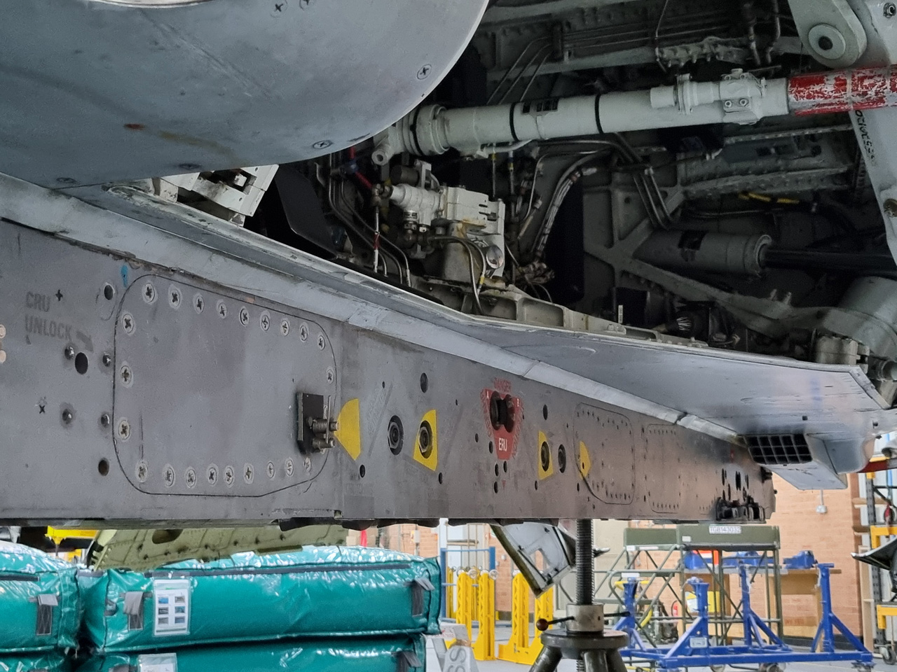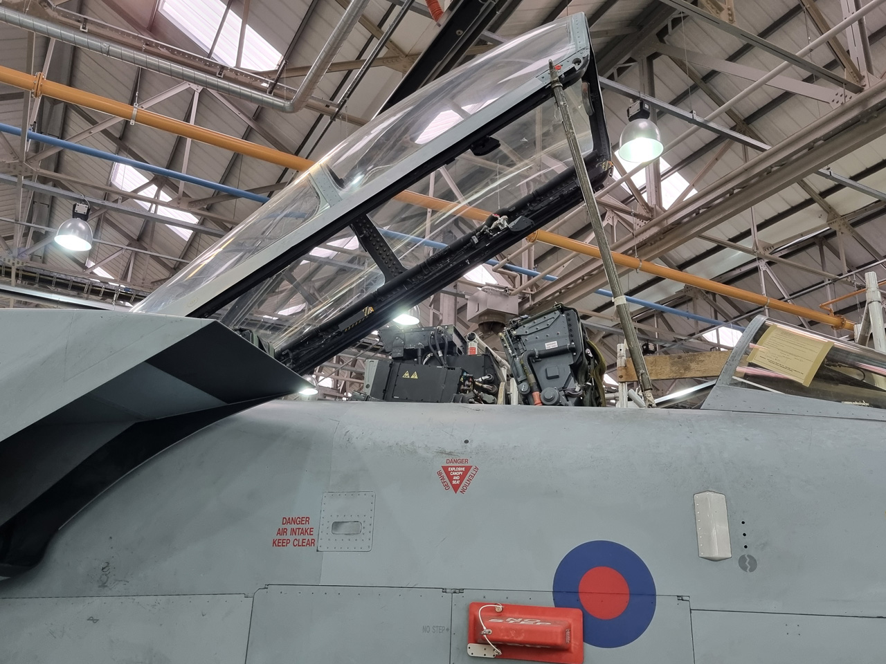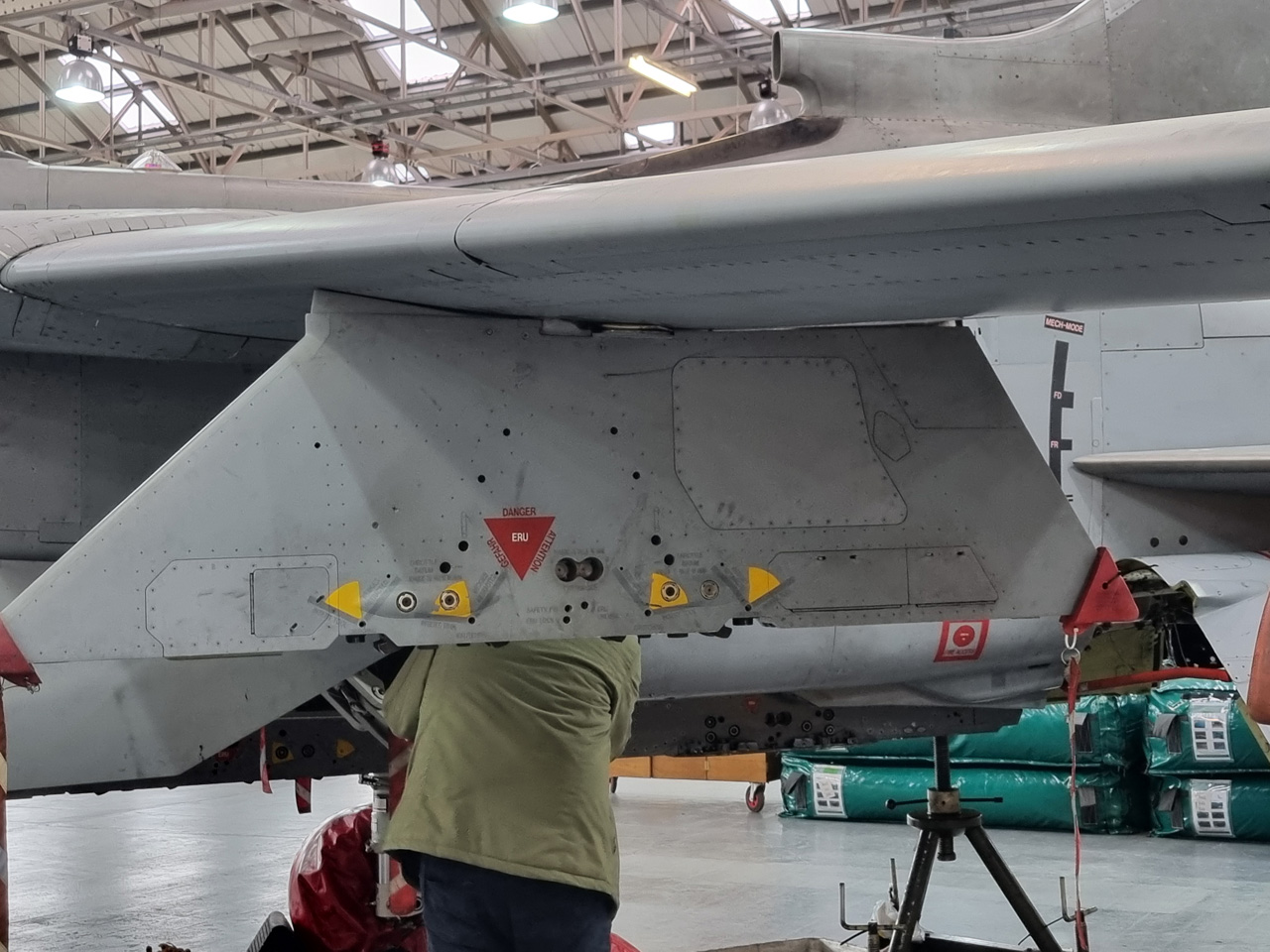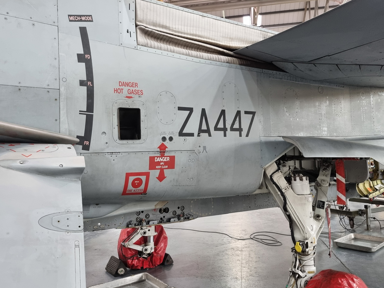 Die Mig Eater-Tornado stand in einfachem Grau in Cosford. Dafür wurde eine andere Tornado in der Wüstentarnung der Operationen Granby und Telic* lackiert und mit dem Haifischmaul der ZA447 versehen, das diese im Golfkrieg trug. Die im Wüstentarn bemalte Maschine war aber selbst nie dort im Einsatz und wurde erst später umlackiert. Interessant auch die Crash Pads unter den Flügeln, um die Verletzungsgefahr bei Stürzen vom Flügel zu verringern.