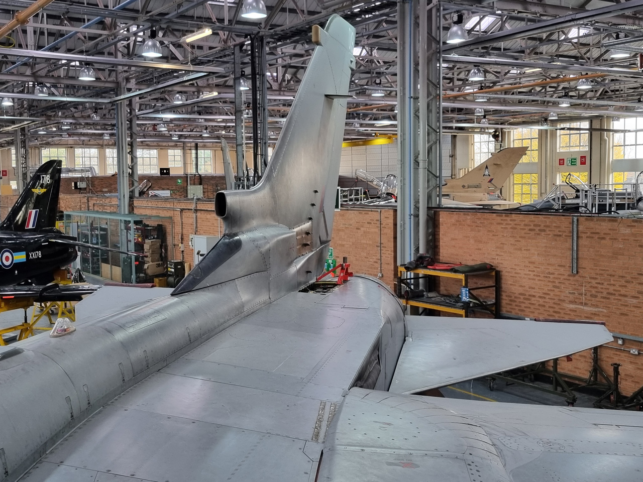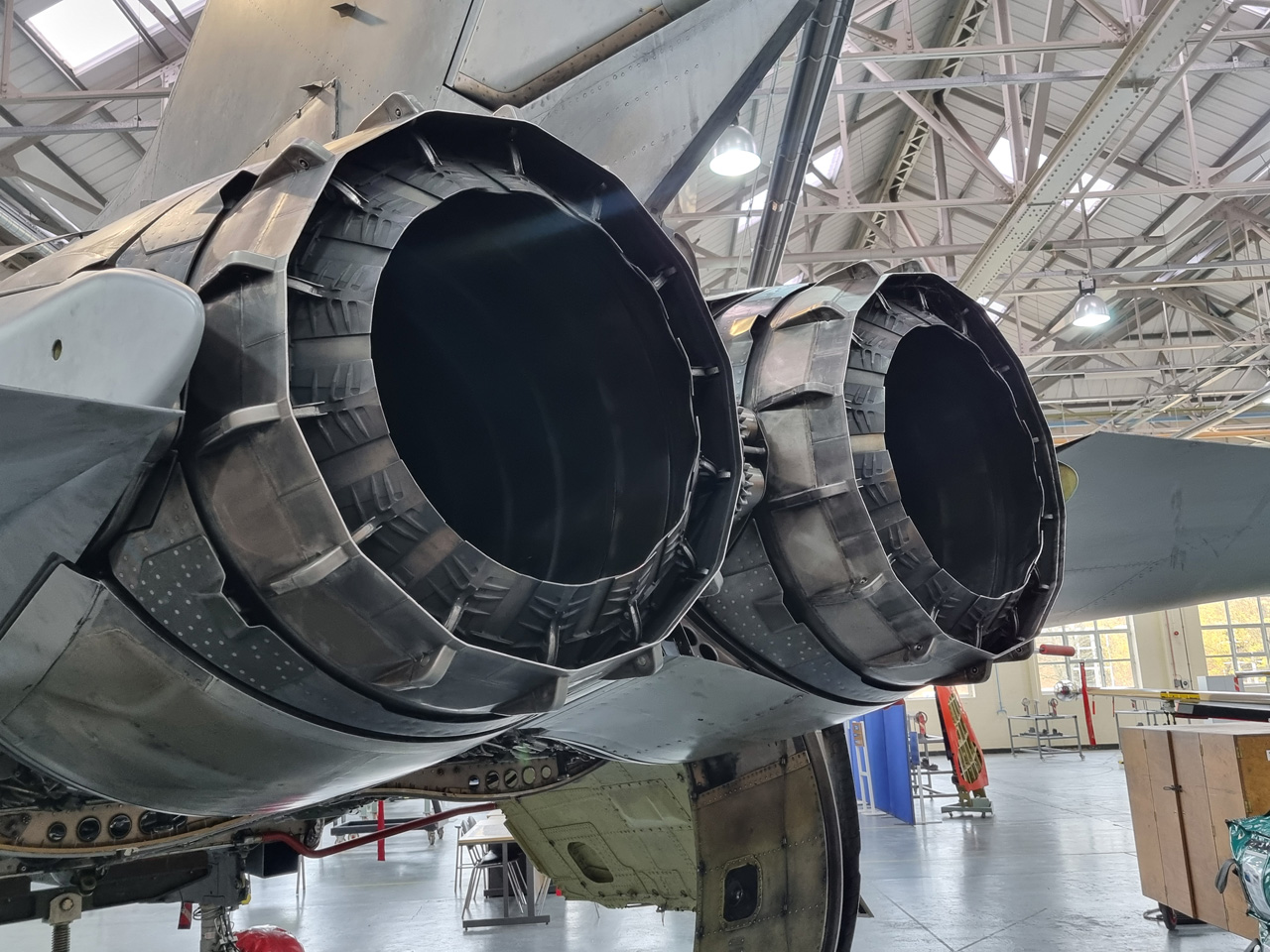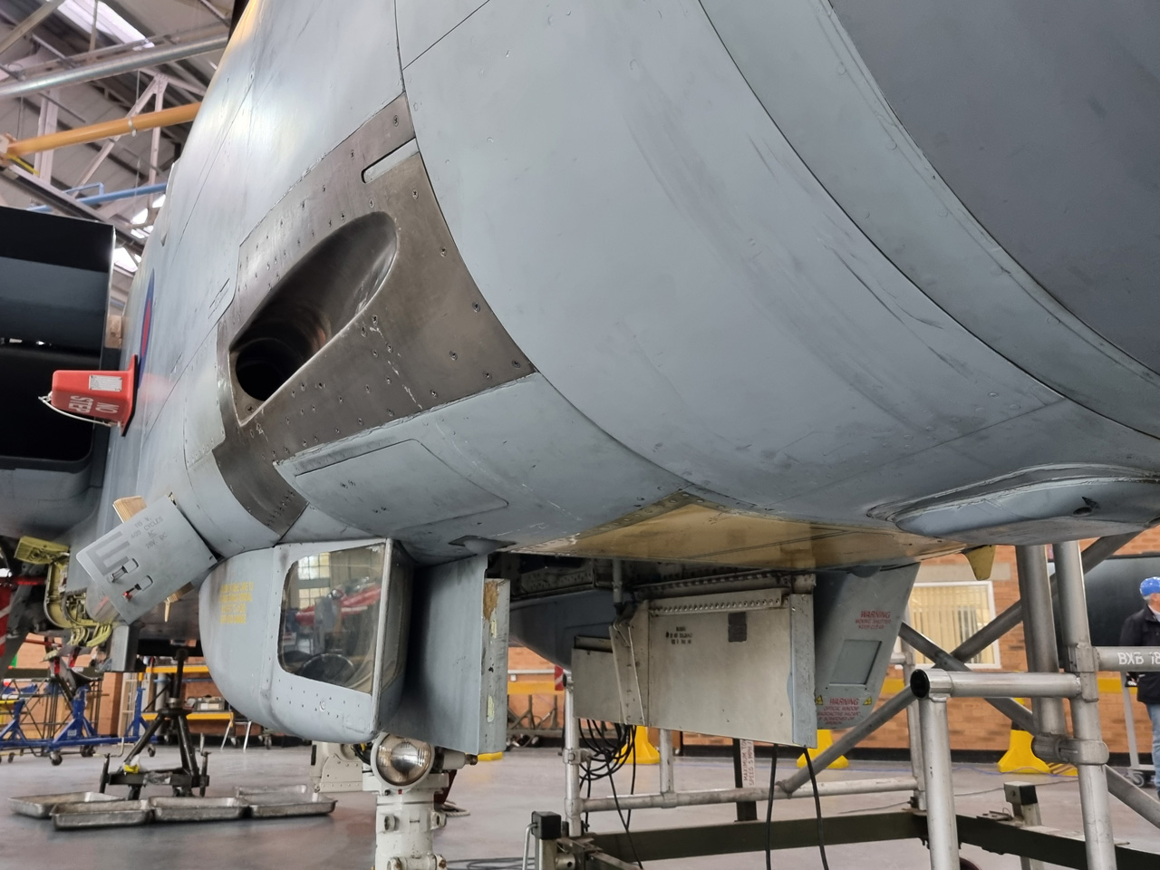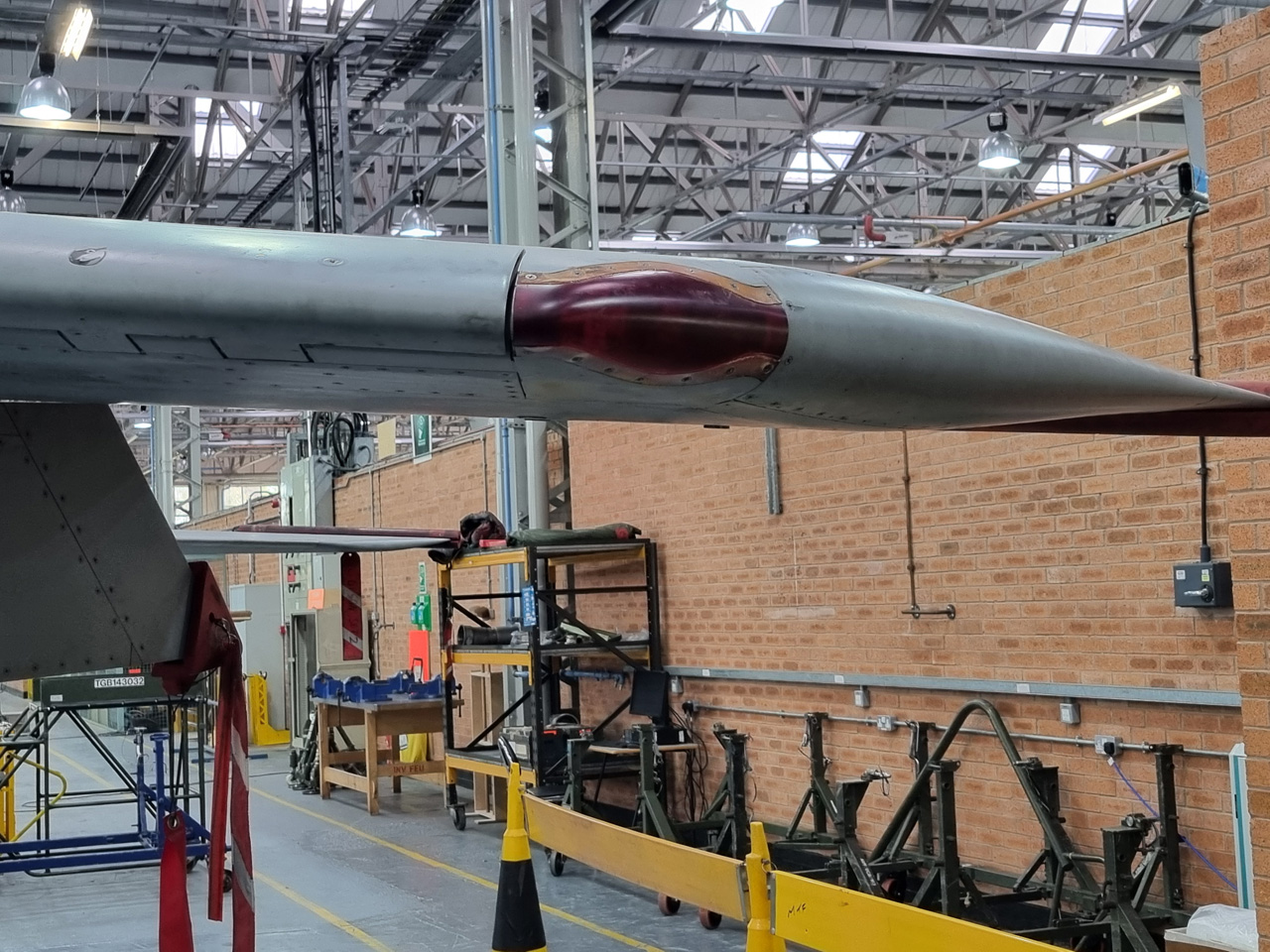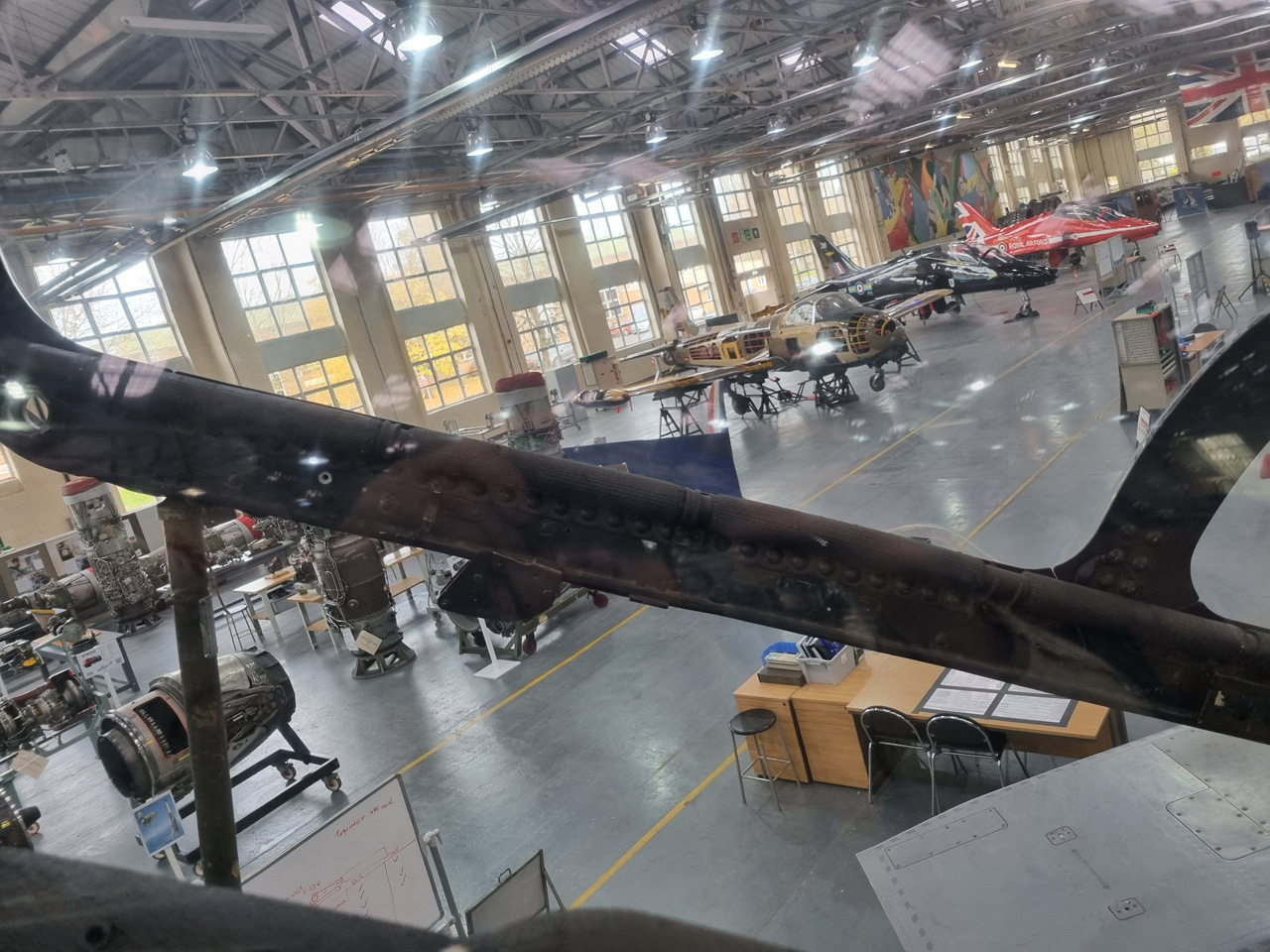 Die Mig Eater-Tornado stand in einfachem Grau in Cosford. Dafür wurde eine andere Tornado in der Wüstentarnung der Operationen Granby und Telic* lackiert und mit dem Haifischmaul der ZA447 versehen, das diese im Golfkrieg trug. Die im Wüstentarn bemalte Maschine war aber selbst nie dort im Einsatz und wurde erst später umlackiert. Interessant auch die Crash Pads unter den Flügeln, um die Verletzungsgefahr bei Stürzen vom Flügel zu verringern.