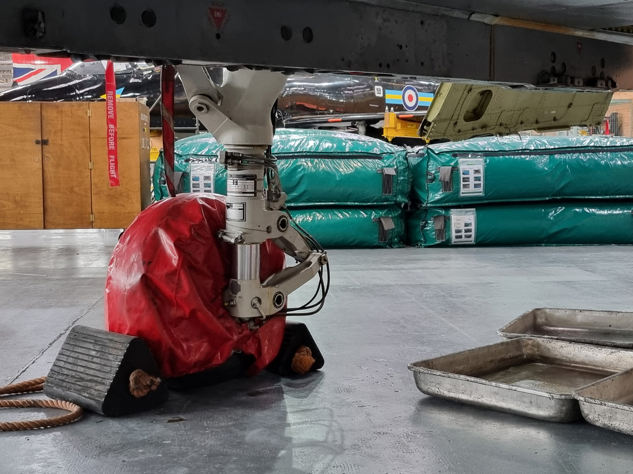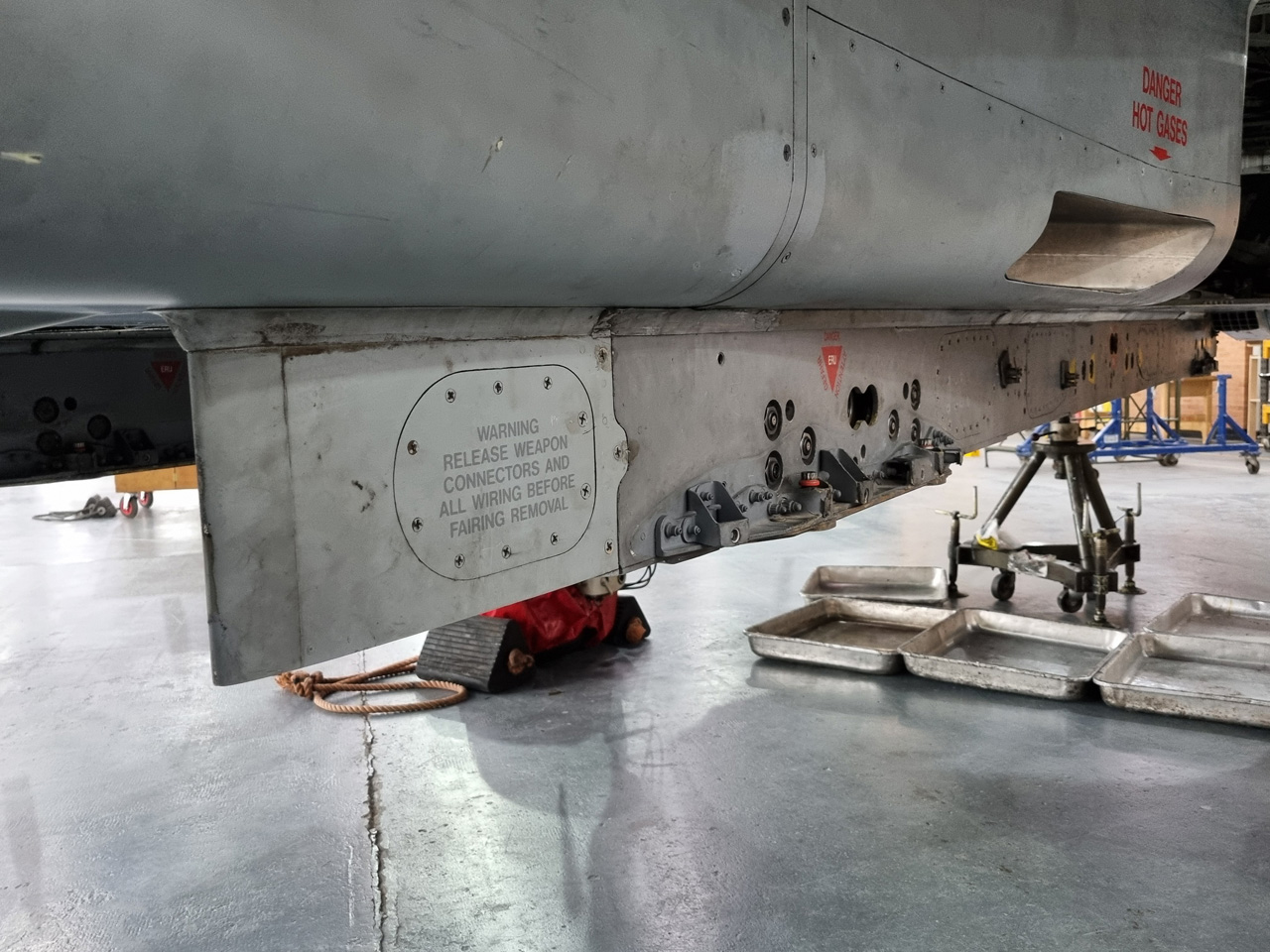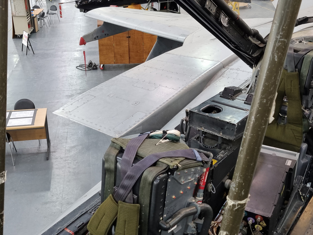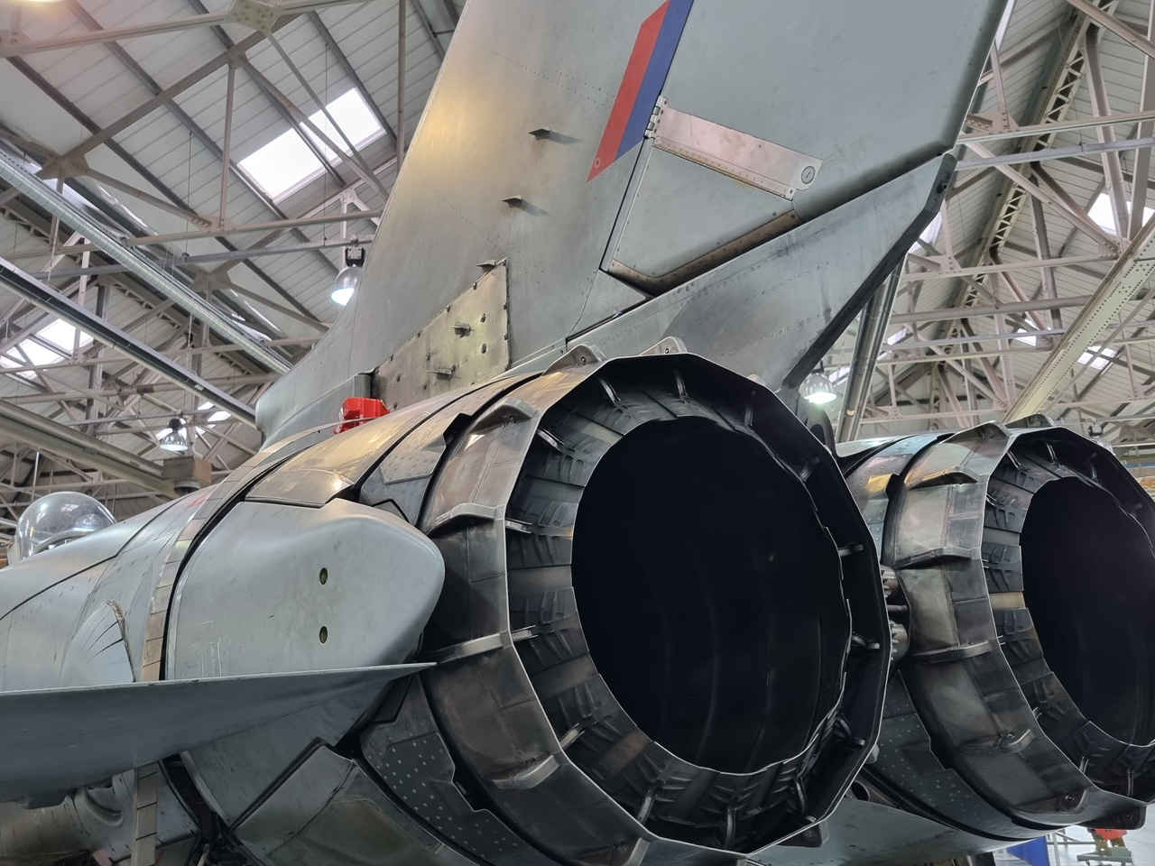 Die Mig Eater-Tornado stand in einfachem Grau in Cosford. Dafür wurde eine andere Tornado in der Wüstentarnung der Operationen Granby und Telic* lackiert und mit dem Haifischmaul der ZA447 versehen, das diese im Golfkrieg trug. Die im Wüstentarn bemalte Maschine war aber selbst nie dort im Einsatz und wurde erst später umlackiert. Interessant auch die Crash Pads unter den Flügeln, um die Verletzungsgefahr bei Stürzen vom Flügel zu verringern.